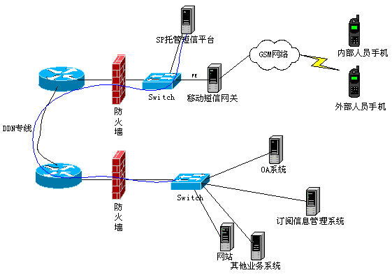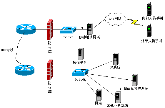 短信平台结构 体系结构说明: 3、 短信应用服务可以通过扩展功能访问企业内部数据库。 网络连接说明: 方案说明: