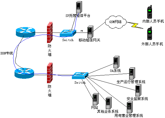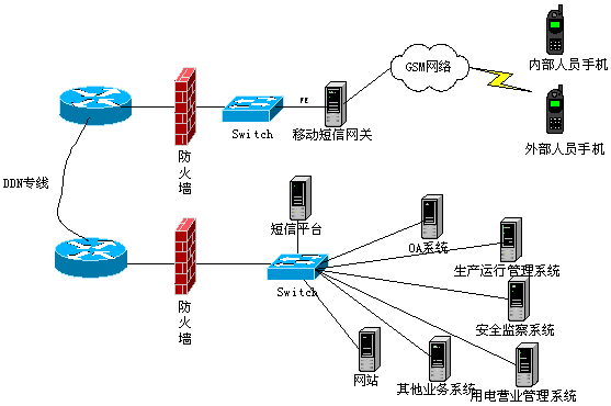 行业需求 电力企业在信息化的历史上有着相对悠久的历史,在多年的信息系统应用中,建立面向各个部门、各个子业务流程的信息管理软件,这些软件系统为企业的生产管理做出了应有的作用,同时建立是企业业务人员认识和熟悉了信息系统的使用和作用。 面对改革的深入和国家电力公司为电力企业制定的基本改革思路-“打破垄断、引入竞争、提高效率、降低电价、改善服务、促进发展”,电力企业要想在新的改革和市场竞争中获胜,就要使企业具备敏锐的市场触角、要有与世界接轨的经营理念、要有完善系统的管理机制、要有面向用户为中心的服务体制……要达到这些目标,"服务"成为现代电力最为重视的课题之一。谁能为用户提供更好的服务,谁就能获得更高的客户满意度,谁就能赢得更多的市场。而发现、强化、完善和不断提高服务手段,同时降低服务成本,成为与产品、质量同样重要的方面。 作为一种信息通道,短信息因其高效率、低成本、快速简便和安全性等特性,极其适合作为企业向客户提供延伸、互动和个性化的优质服务。可以预见,在未来几年中,随着经济、技术以及网络设施的不断发展,短信息将成为电力向客户提供服务的重要手段。另外,电力内部业务人员的交流、信息汇总以及反馈的有效运作也是一个问题。传统媒体以及目前的网络发展似乎能在一定程度上满足企业的一定要求,但电力内部、电力与客户沟通的互动性却无法达到理想的效果。短信的广泛应用为企业解决以上诸多难题提供了一个契机,应该说短信的应用是对传统交流手段的扩充和弥补。电力短信应用平台的构建成为迫在眉睫的项目,为电力在新经济时代制胜提供了保障。 如下图所示: